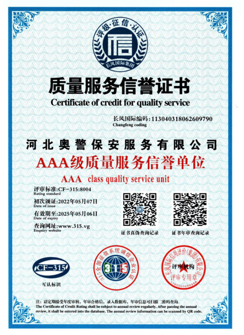 “忠誠的伙伴,非凡的朋友”,河北奧警保安服務(wù)有限公司本著“客戶的需求就是我們的追求”的服務(wù)理念,與廣大客戶攜手并進、共創(chuàng)恢弘偉業(yè)。